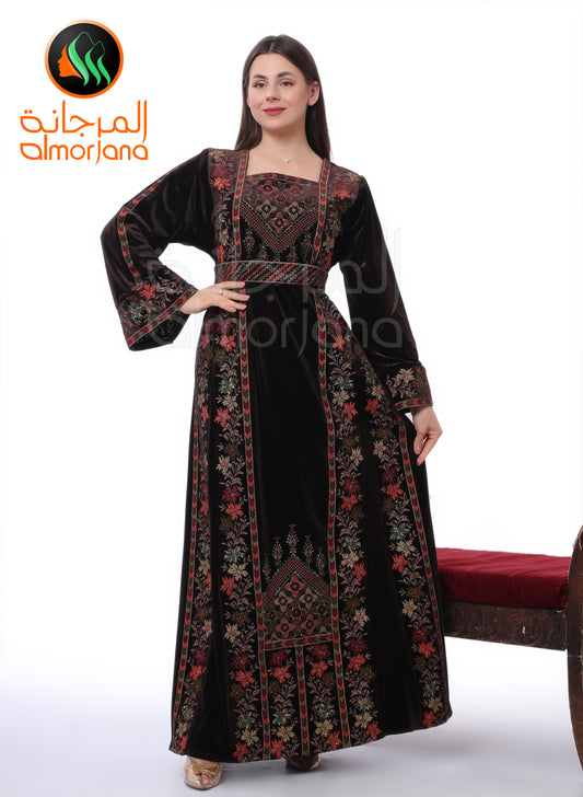 Brown Velvet Almorjana Embroidered Dress , Traditional Dress , Thobe Falah